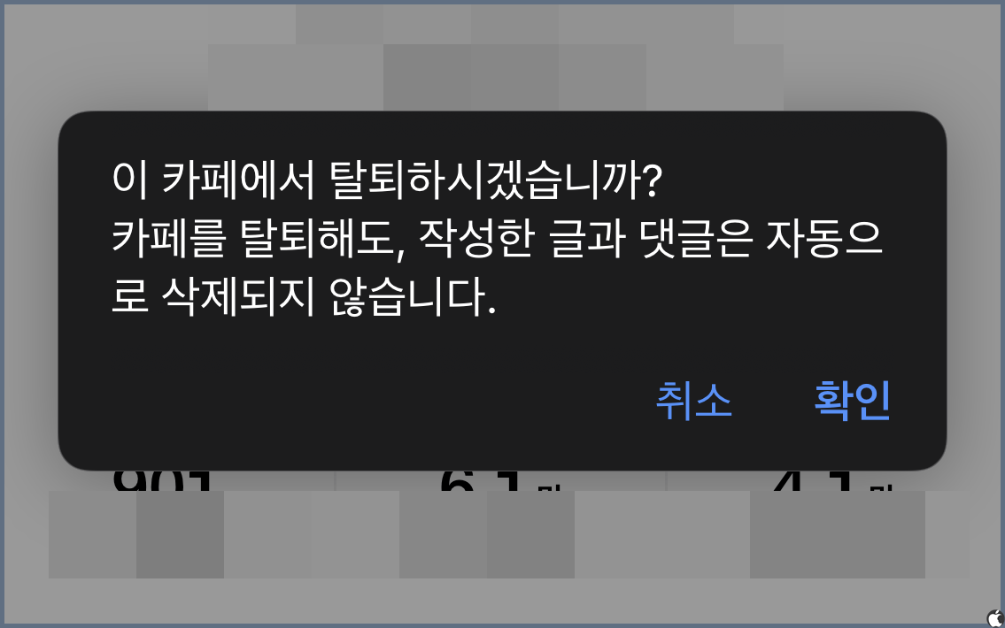 이 버튼을 누르면 이런 식으로 확인 안내 창이 나타나고, 여기서는 카페를 탈퇴할 경우에도 지금껏 작성했던 글과 댓글은 삭제되지 않는다는 것을 안내해주고 있습니다. 그러니 내가 남겼던 흔적을 모두 지우고 싶다면 미리 삭제한 뒤 탈퇴해주셔야 합니다.