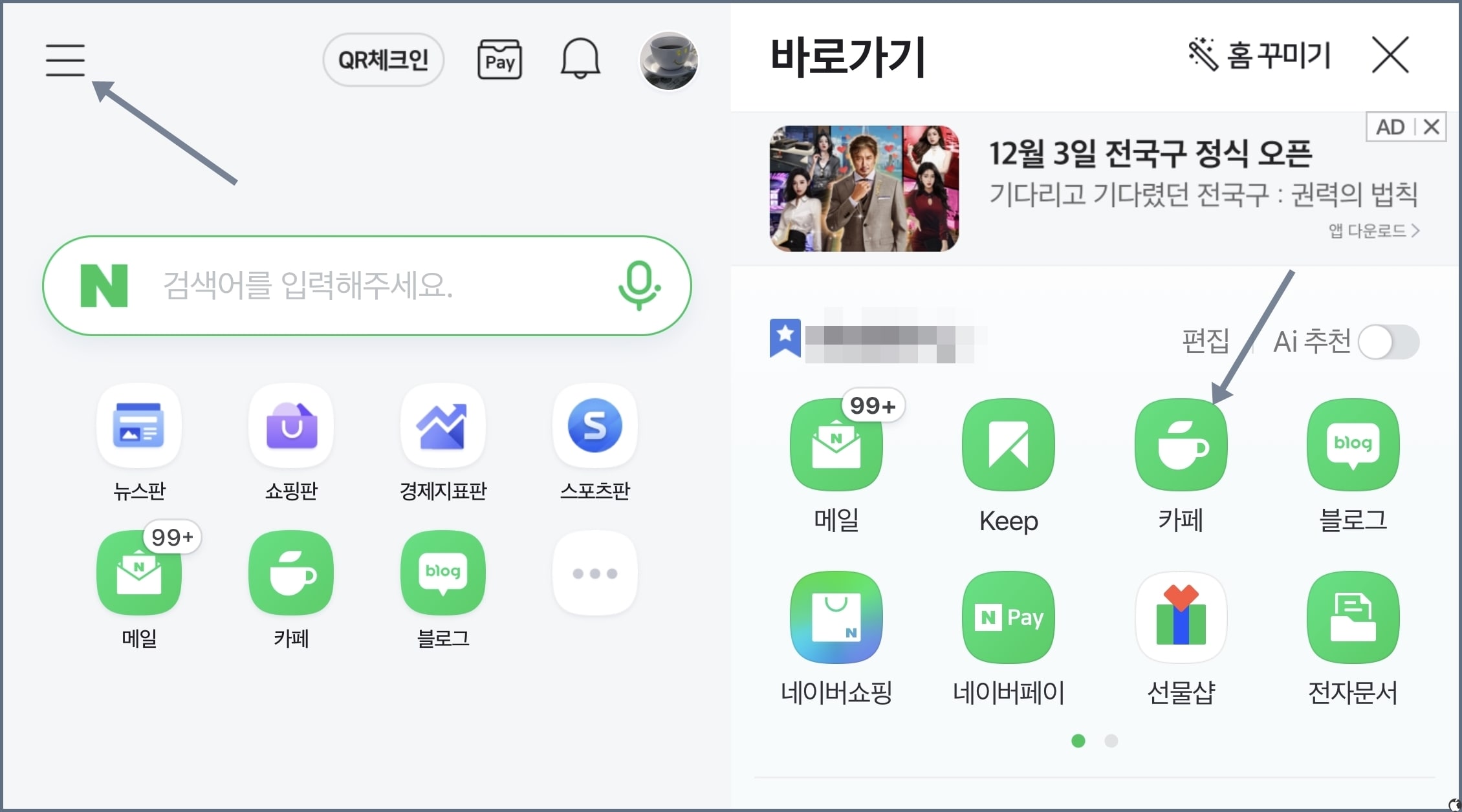보시는 것처럼 왼쪽 위에 있는 목록 버튼을 선택하면 여기서도 들어갈 수 있으니 참고해주시고요. 여기까지 진행했다면 이제 내가 탈퇴하고자 하는 카페에 들어가 주세요.