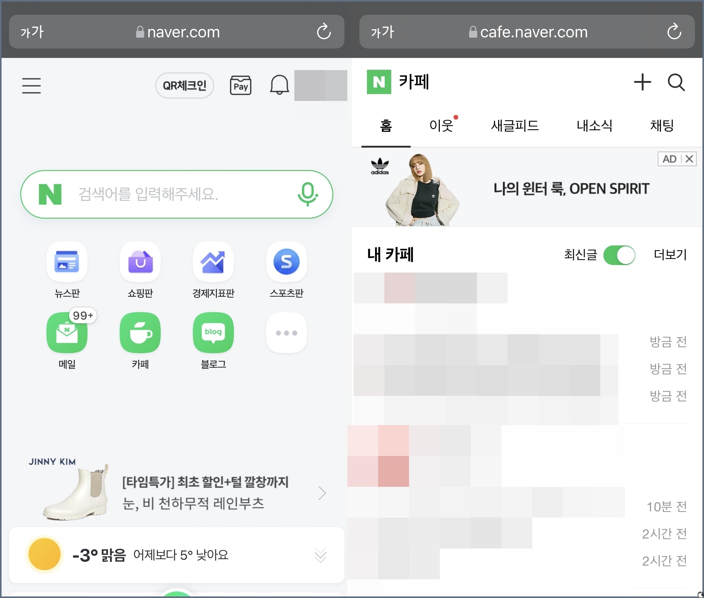 먼저 평소 내가 이용하는 모바일 인터넷 앱으로 접속해서 네이버에 로그인을 해주세요. 그리고 카페 메뉴로 들어가시면 되는데요. 혹시 저처럼 메인화면에 카페 버튼이 보이지 않는다면 다른 방법으로도 접속할 수 있습니다.